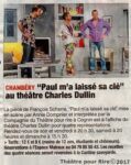 … galerie photos en bas de page… PAUL M’A LAISSÉ SA CLÉ comédie de François SCHARRE ! Jouée : 7 fois COGNIN, salle de la Forgerie, 4 fois à CHAMBERY, salle Charles Dullin, 3 fois à LA MOTTE SERVOLEX, salle St Jean, La Générale à COGNIN, Salle de la Forgerie, a… Continuer à lire